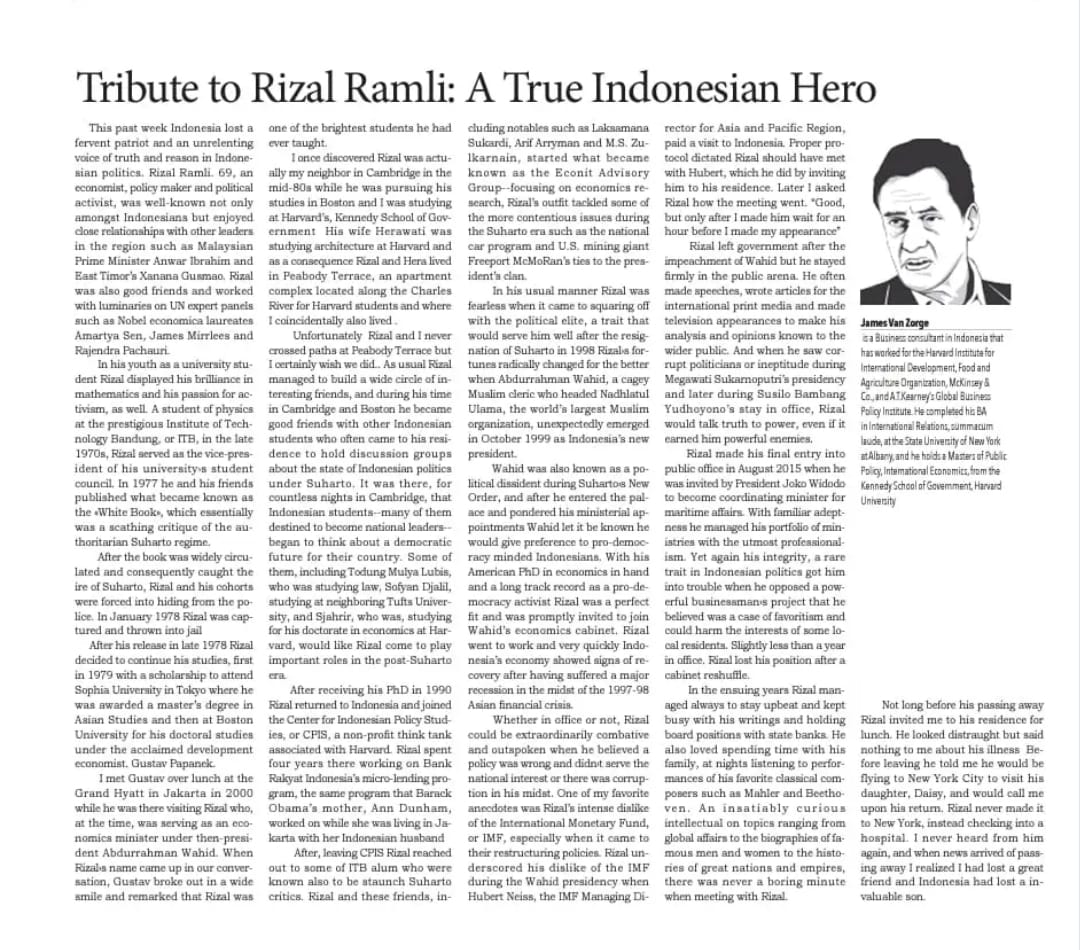 Artikel ini adalah sebuah obituari atau tulisan penghormatan untuk Rizal Ramli, yang digambarkan sebagai seorang patriot, ekonom, pembuat kebijakan, dan aktivis politik Indonesia. Tulisan ini mengisahkan perjalanan hidup dan karier Rizal Ramli, mulai dari masa kuliahnya di ITB, aktivitasnya sebagai aktivis mahasiswa yang membuatnya dipenjara pada era Orde Baru, hingga studinya di Jepang dan Boston University. Disebutkan pertemanannya dengan tokoh-tokoh internasional seperti Anwar Ibrahim (Malaysia) dan Xanana Gusmao (Timor Leste).