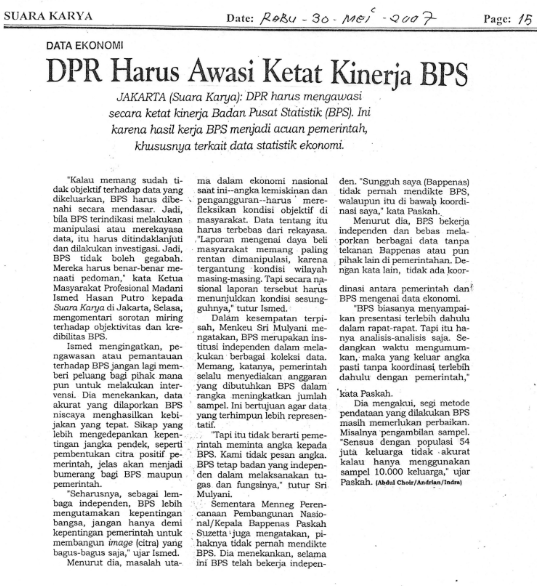 Artikel ini membahas mengenai perlunya pengawasan ketat DPR terhadap kinerja Badan Pusat Statistik (BPS) karena hasil kerjanya menjadi acuan pemerintah, khususnya terkait data statistik ekonomi. Ismed Hasan Putro, Ketua Masyarakat Profesional Madani, menyoroti objektivitas dan kredibilitas BPS, menekankan bahwa BPS harus dibenahi secara mendasar jika terindikasi manipulasi data. Ia juga mengingatkan agar tidak ada intervensi dari pihak manapun terhadap BPS. Menteri Keuangan Sri Mulyani dan Kepala Bappenas Paskah Suzetta menyatakan bahwa BPS adalah institusi independen dan tidak ada dikte dari pemerintah terkait data ekonomi. Paskah Suzetta juga mengakui bahwa metode pendataan BPS masih memerlukan perbaikan, terutama dalam pengambilan sampel.